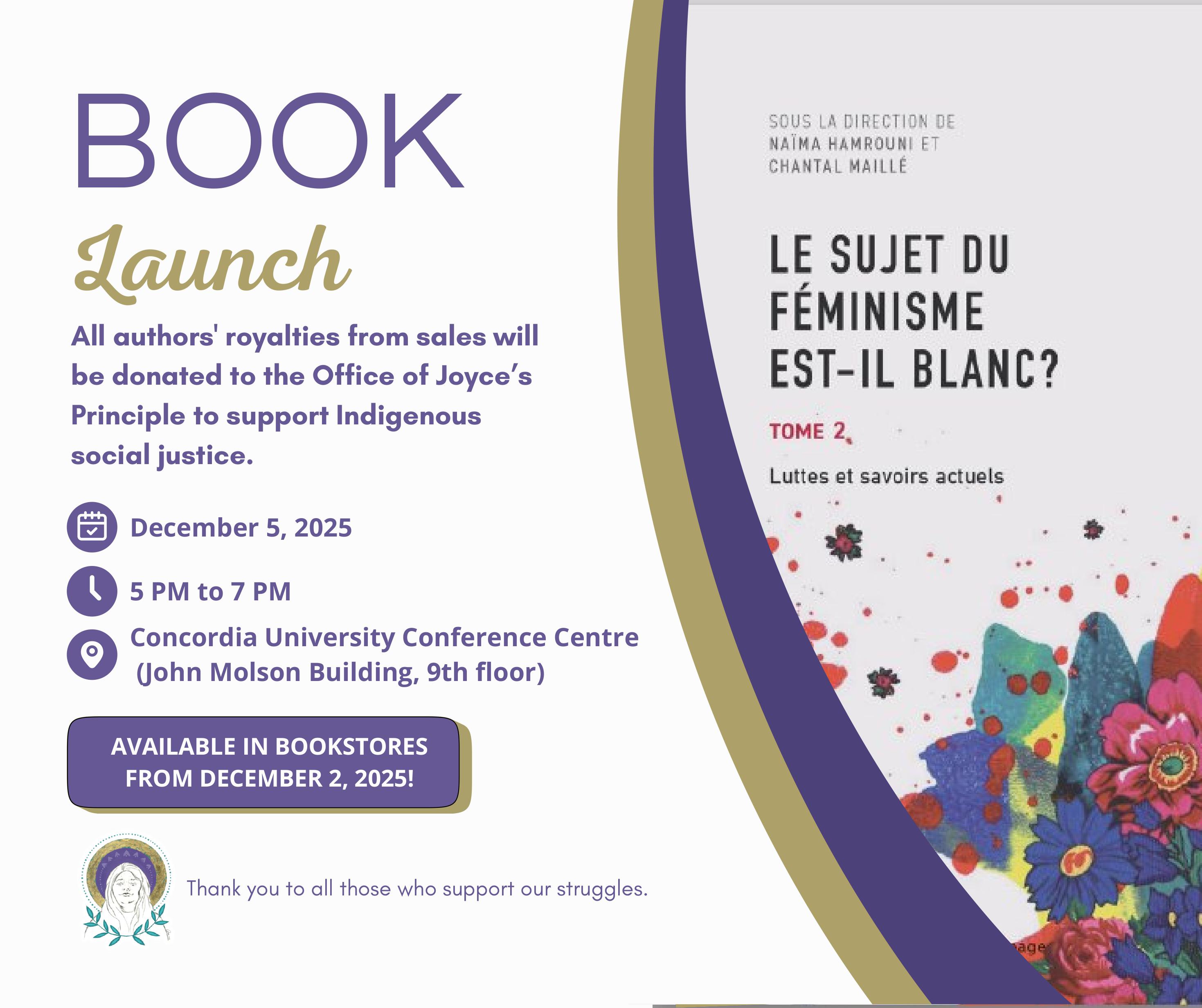 It is with a great pleasure that the Office of Joyce’ Principle announces the release of the book Is the Subject of Feminism White? Volume 2 – Current Struggles and Knowledge, edited by Naïma Hamrouni and Chantal Maillé, published by Éditions du Remue-Ménage.