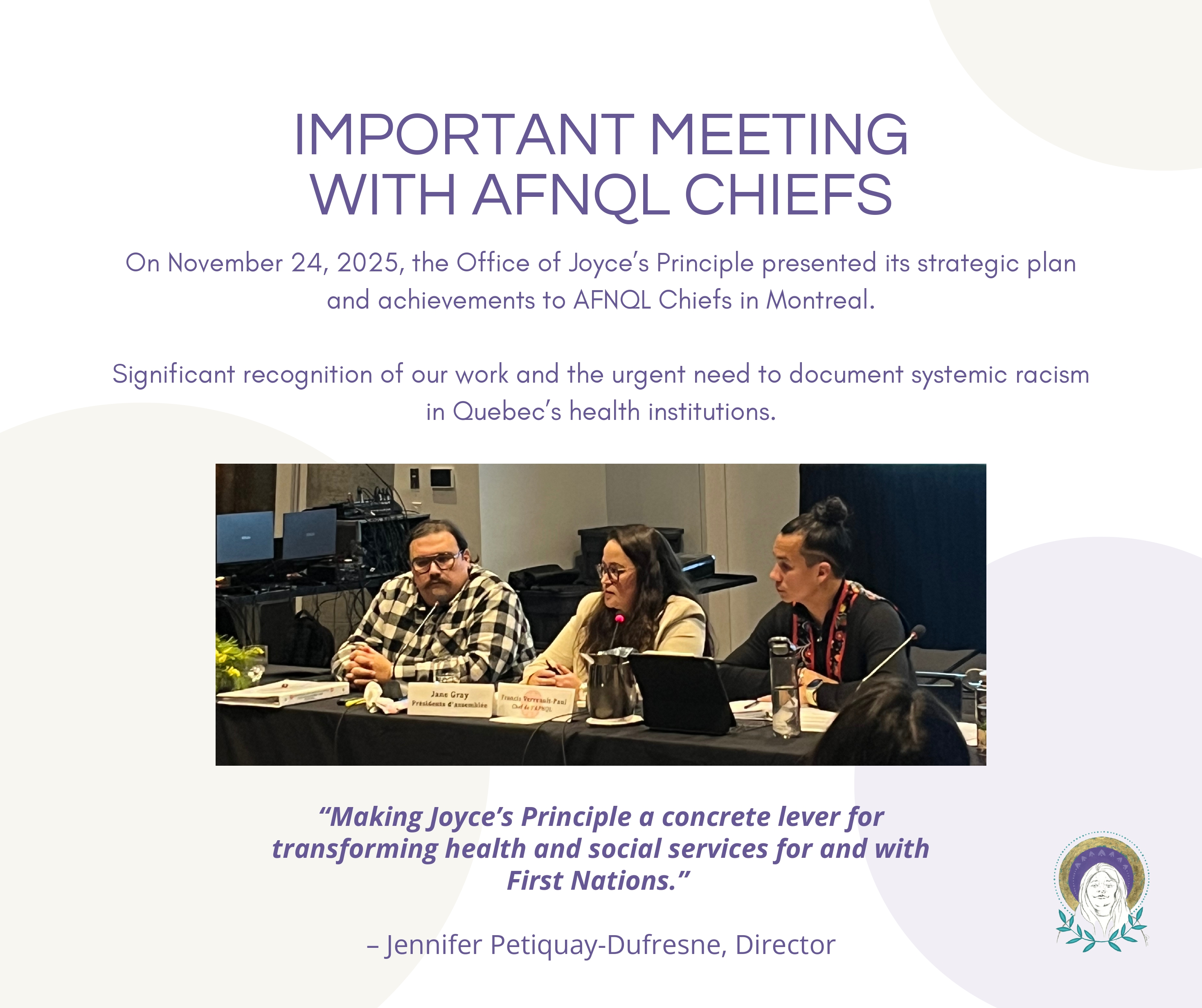 On November 24, the Office of Joyce’s Principle met with the leaders of the Assembly of First Nations Quebec-Labrador (AFNQL) in Montreal to present its mission and current initiatives. Jennifer Petiquay-Dufresne - Executive Director, Julia Dubé - External Relations Officer and Claudette Awashish - Community Relations Officer, represented the Office at this meeting, which was marked by constructive discussions on promoting Joyce’s Principle and future collaborations.